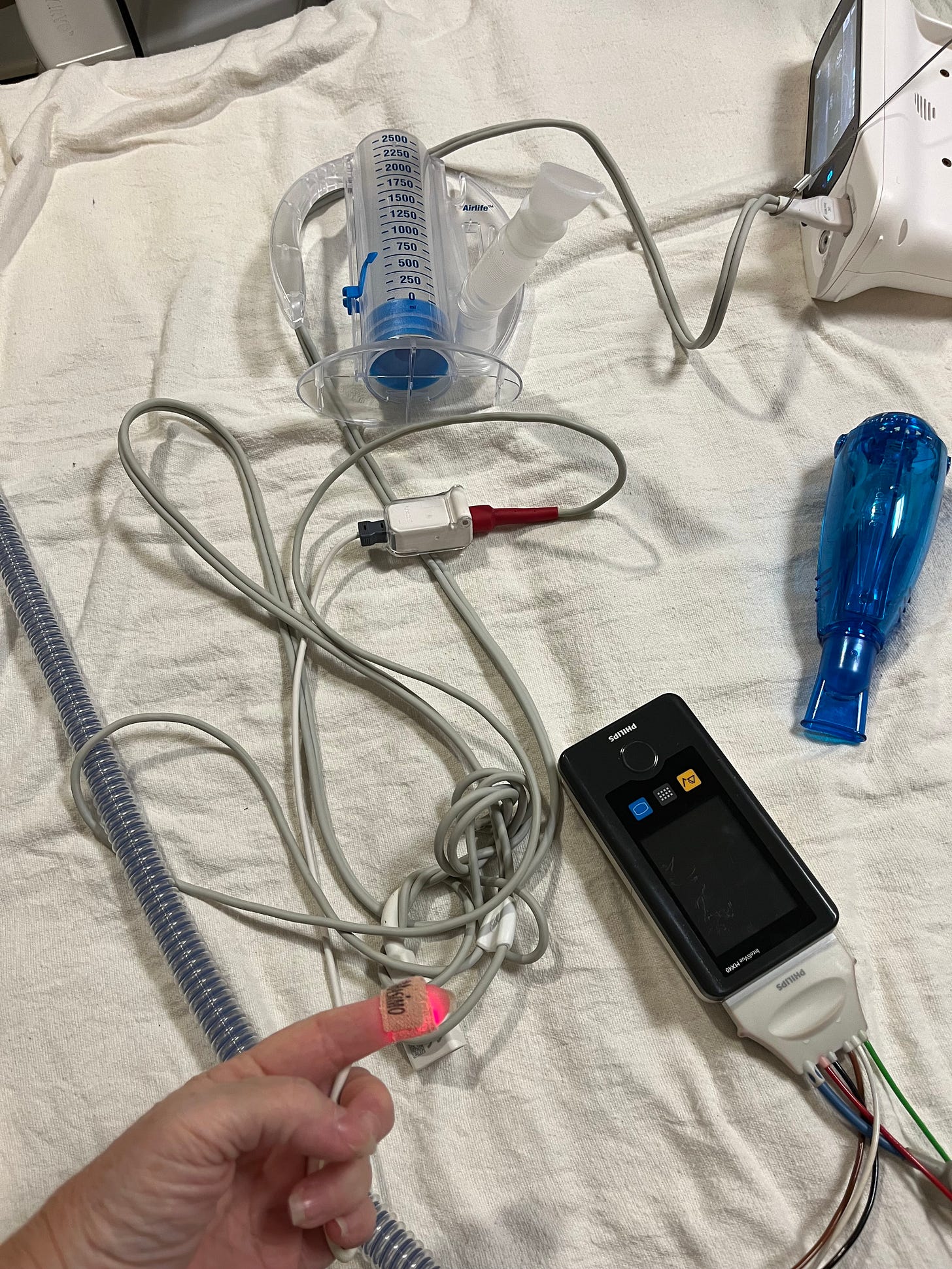 I went the full length of the test but couldn’t recover fast enough for them. I maxed out at using 15 liters of oxygen. My tech got all fussy and told me you likely aren’t going anywhere but across the street to the hospital. I thought, what are you saying? You’re kidding, right? He sent me back to my transplant coordinator.